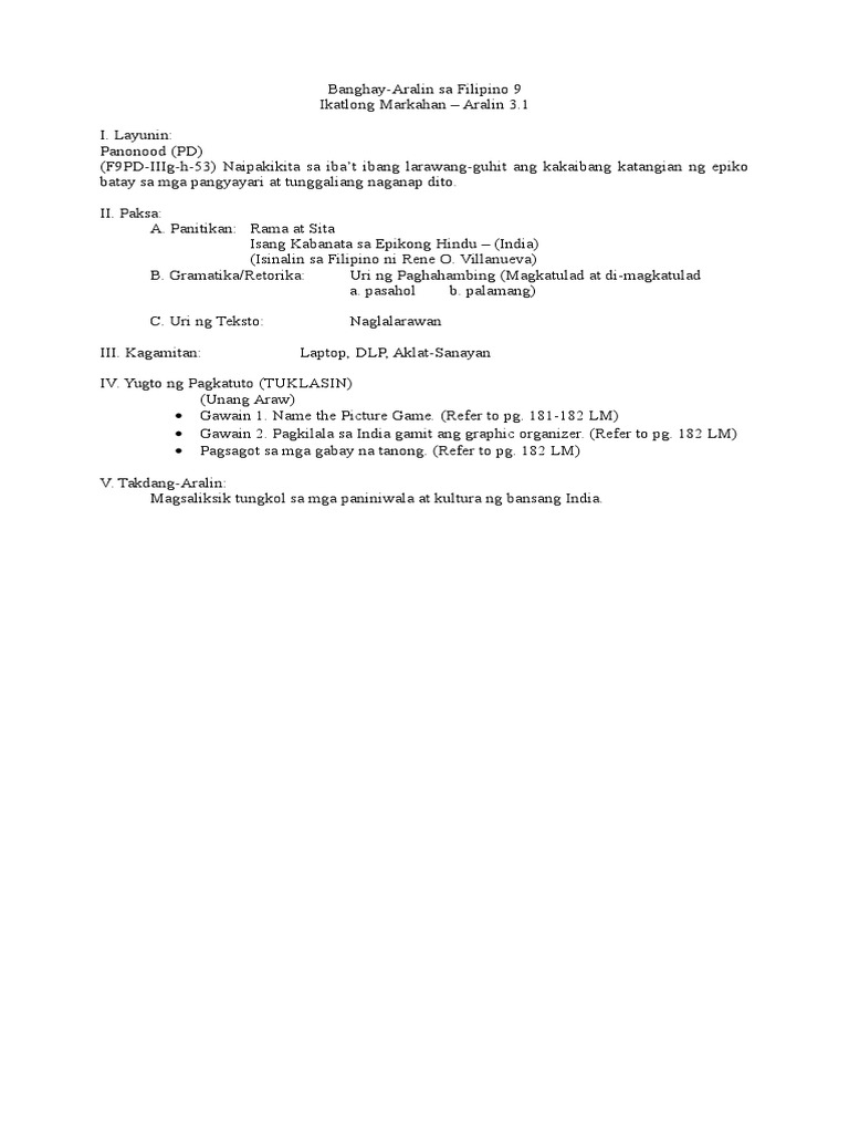 Dll Aralin 3 1 Rama At Sita 17 18 Docx Daily Lesson Log Sa Filipino Thailan Baitang 9 Ikatlong Markahan Nobyembre 20 24 2017 Saudi Arabia Course Hero